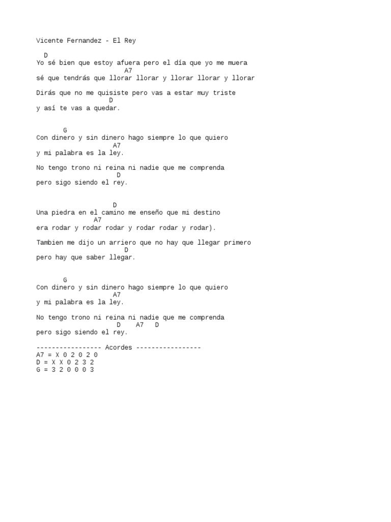 Acordes A Yo se bien que estoy afuera pero el día que yo me muera E7 se que tendrás que llorar dirás que no me quisiste pero vas a estar muy triste A y así te vas a quedar D Con dinero y sin dinero hago siempre lo que quiero E7 y mi palabra es la ley no tengo trono ni reyna ni nadie que me comprenca A pero sigo siendo el rey Una piedra en el. Verse D Una piedra en el camino me enseño que mi destino A7 era rodar y rodar rodar y rodar rodar y rodar. Aprende a tocar el cifrado de El Rey Vicente Fernández en Cifra Club.